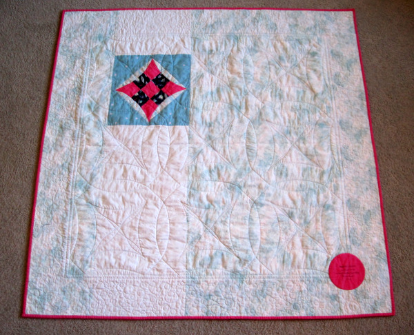 Little Miss Marta is now 14 months old. I figured I’d better hurry up and get her quilt done before she graduates from college. I had done some preliminary stitching in the ditch to stabilize the blocks in preparation for FMQ. I stitched in more ditches and then quilted ribbons in the center of each block and a loop-de-loop in the borders to finish it.