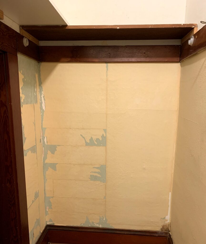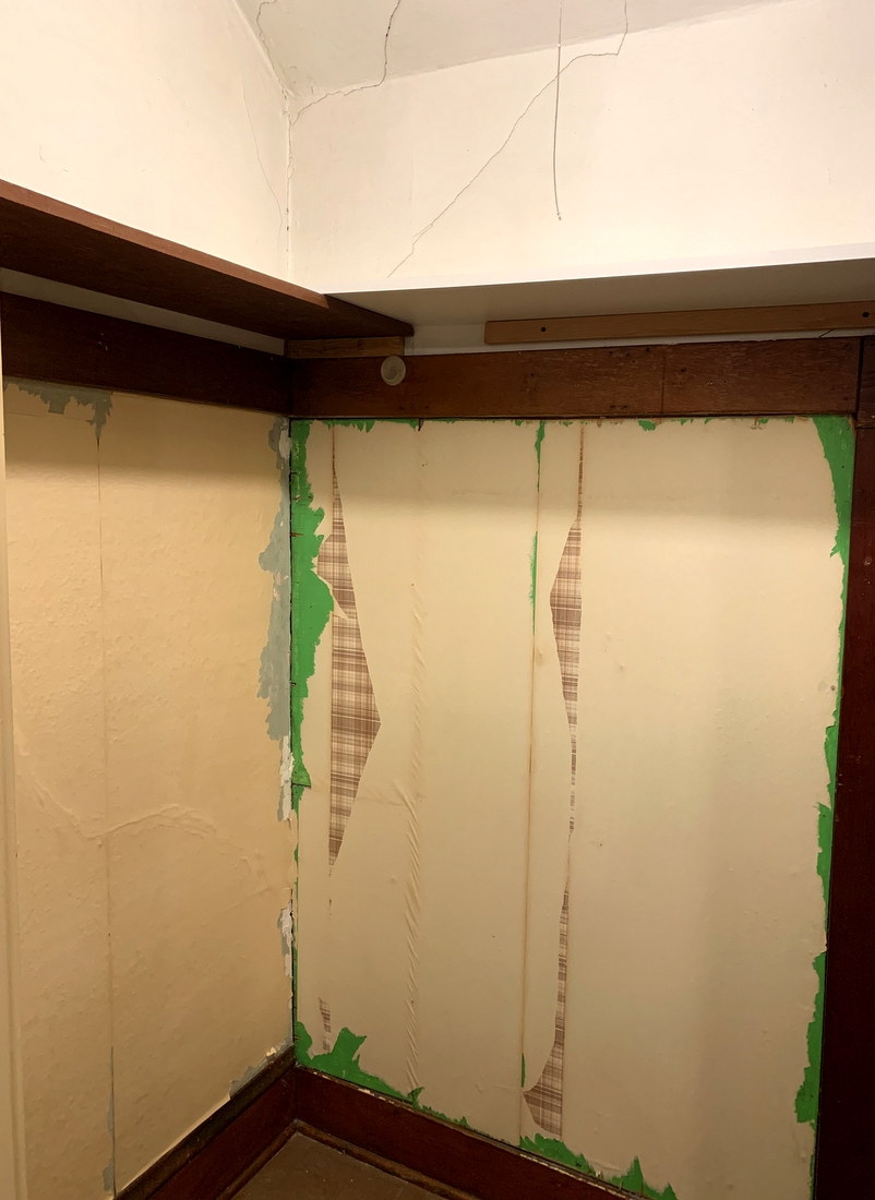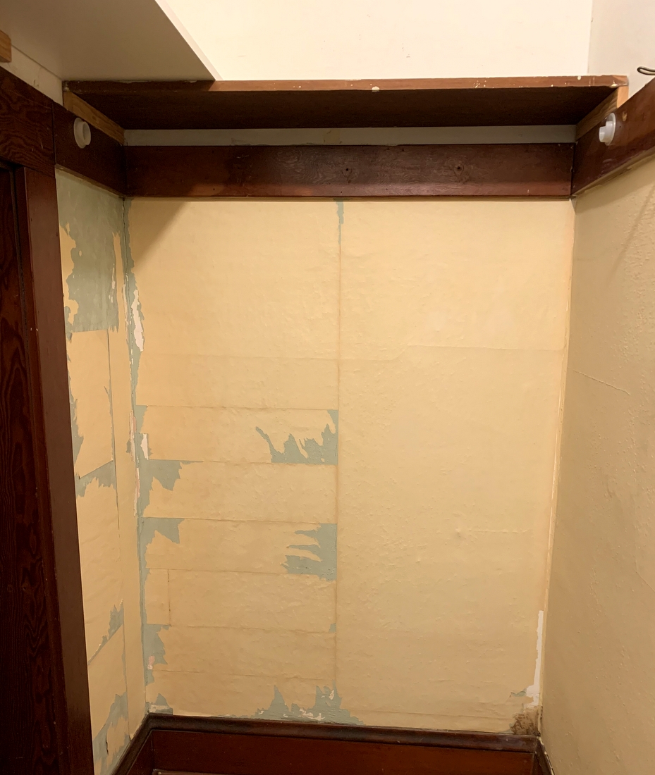 See that green paint? That’s a piece of plywood that was nailed onto lath strips behind it and then wallpapered. The plaster job suddenly loomed larger.