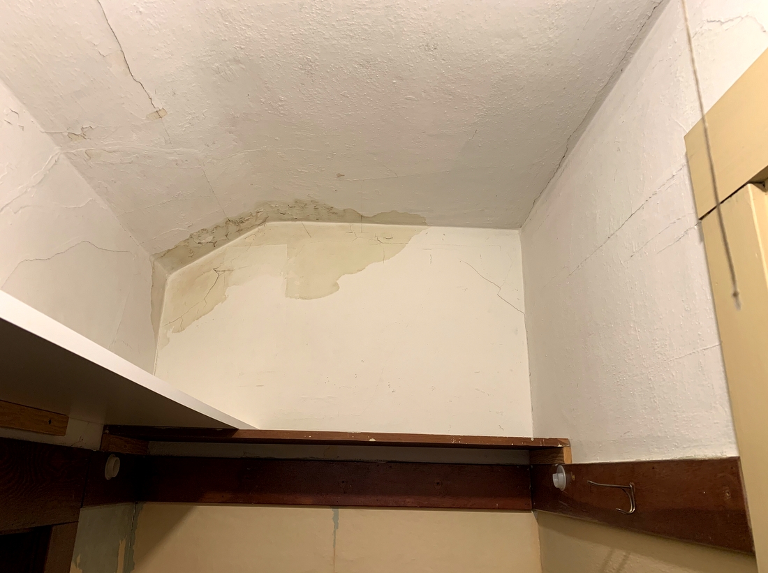 You’re looking at one upper corner of my sewing room closet shortly before it underwent a transformation. I hired a master plasterer to repair the ceiling and upper walls, which have been in this sorry condition for — well, let’s just say it’s been a while.