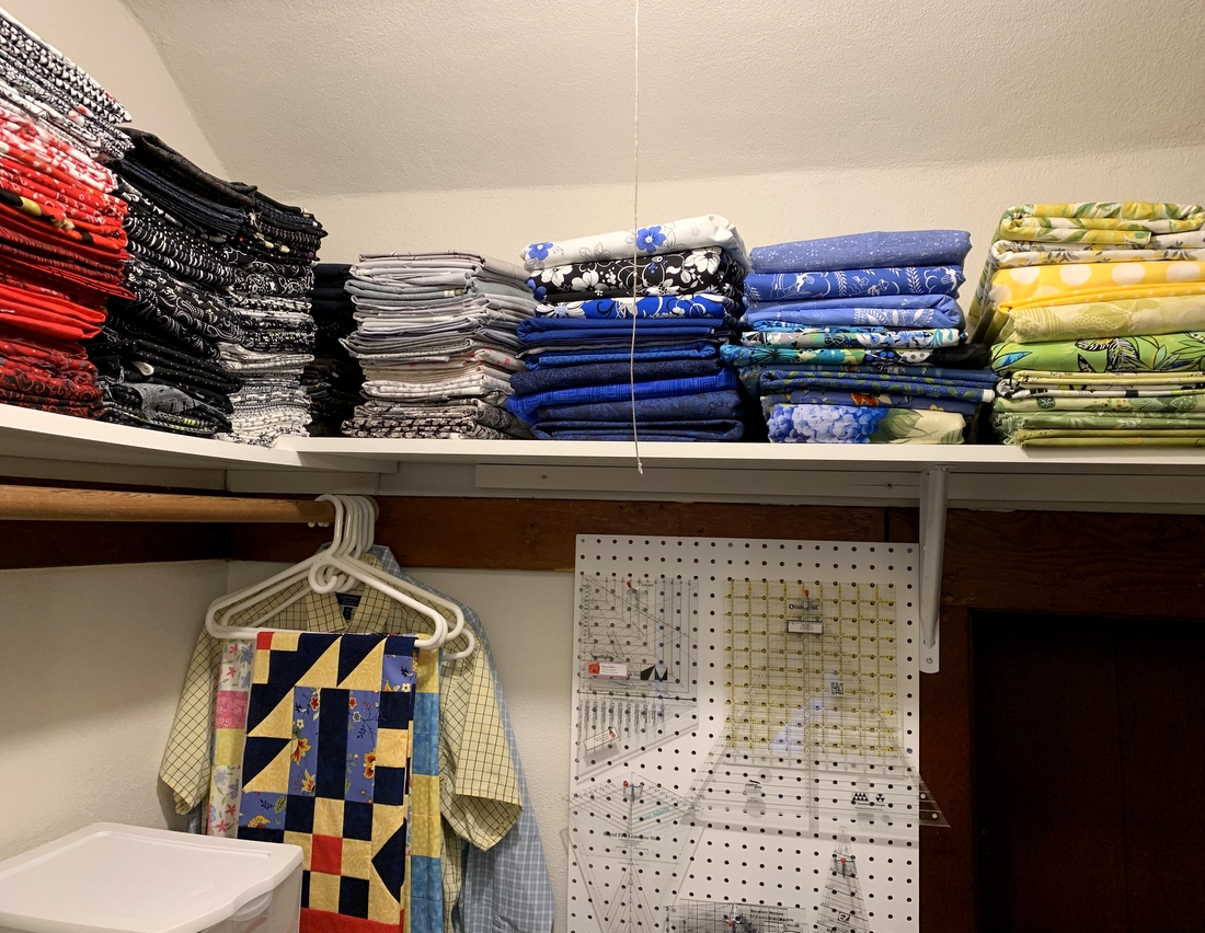 After living in our 1913 Craftsman house for 40 years, I had completely filled this 3½ x 7½-foot closet. It was, in my sister Diane’s words, “crammed to the gunnels.” Stacks of fabric on three upper shelves. Storage carts, plastic bins, and a garage sale dresser along the lower walls . . . you get the picture.